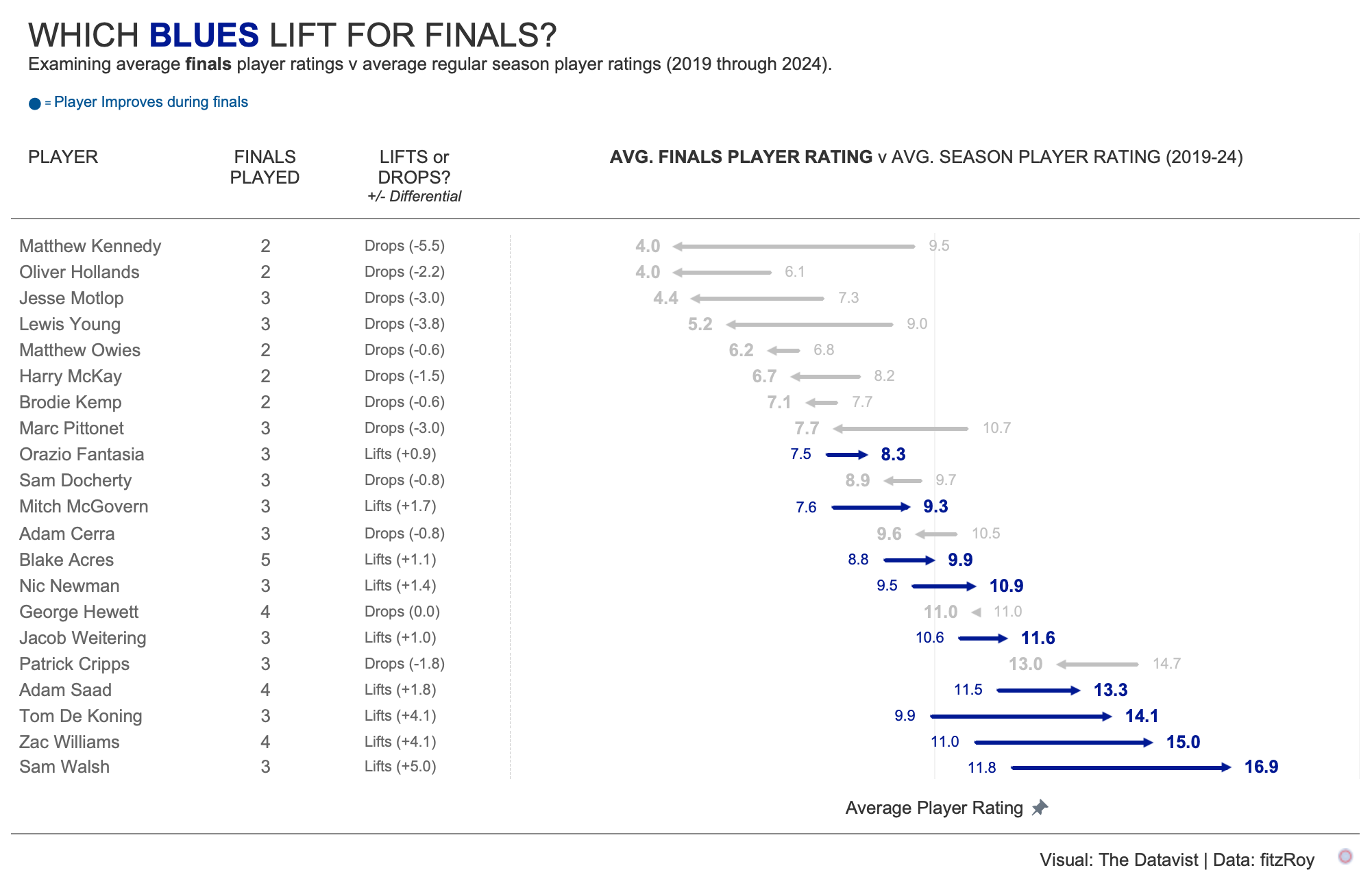 The results threw up some interesting results – showing that typically more than half of the players in the Lions squad for the game against the Blues, who have played finals before, typically underperform relative to their regular season ratings.